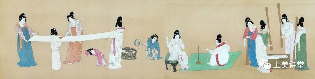 它的布色技巧高超,巧妙的把各种关系通过相浑形成一种艺术效果,绘画语言里有个关键部分是“浑”。比如这一部分,人和鼓的两块红色,鼓如果单独放在那里一块红颜色,它很孤立、突兀、呆板。那么旁边放了一个人,两个形就把这块红既相浑又拉开距离,变成了一个有意味的造型,这是工笔画里巧妙的地方。灰色和黑色的布局,有的相混,形成有节奏的关系。这就造成在这个长卷里有一大块主体的、有分量的形状,使长卷不会给人支离破碎和凌乱的感觉。把视线送到下一个情节里,其中描绘五个仙女的部分,石绿石青为主要色调,红色也不孤立、有呼应,色彩分布巧妙,几个人的分布节奏有聚有散。这张画的线条多有折笔,所以画风较朴素,不华丽。