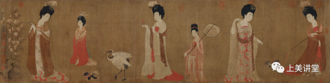 《宫乐图》这幅,以朱砂作为主色调,构图非常饱满,撑满了画面,胖胖的身体使造型非常丰满,脸蛋红红的润,都非常有唐代特色。这张分染的东西不明显,线条显得有点单薄。看仕女面部的晕染,以及用线勾出的的轮廓、体积、量感,是沉敦敦的,我们感到线条的表现力。仕女的小眼睛画得很有味道,密集的线条对疏朗的地方有衬托。之所以没有选择这张临摹,是因为色彩涉及到的技法相对简单一点。