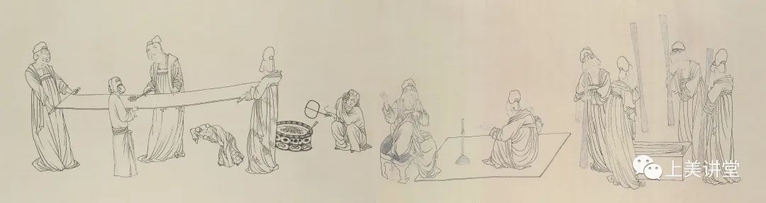 它的布色技巧高超,巧妙的把各种关系通过相浑形成一种艺术效果,绘画语言里有个关键部分是“浑”。比如这一部分,人和鼓的两块红色,鼓如果单独放在那里一块红颜色,它很孤立、突兀、呆板。那么旁边放了一个人,两个形就把这块红既相浑又拉开距离,变成了一个有意味的造型,这是工笔画里巧妙的地方。灰色和黑色的布局,有的相混,形成有节奏的关系。这就造成在这个长卷里有一大块主体的、有分量的形状,使长卷不会给人支离破碎和凌乱的感觉。把视线送到下一个情节里,其中描绘五个仙女的部分,石绿石青为主要色调,红色也不孤立、有呼应,色彩分布巧妙,几个人的分布节奏有聚有散。这张画的线条多有折笔,所以画风较朴素,不华丽。