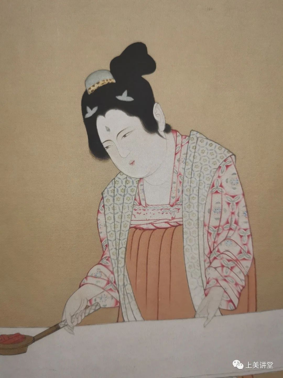 衬染(垫染),这幅画的背面大面积用白颜色衬染。提染,是在面部上面提一些特殊部位,比如额头、鼻子、下巴,把亮的部分增加出来,提染非常出效果,但画过分了又俗了。最后复勾,把线条醒出来,精神就出来了。复勾时不一定非要完全沿着原本的线勾,轻松一点、有一点出入也没关系,保持一种原来生动、灵透、自然的感觉。在头发上还有一点技巧,当墨色重不进去的时候,用没有光泽的松烟墨去罩头发,使头发一下子就乌黑了,再用墨色垫染头发,头发就很重,有一种丝绒般的质感。也可以用花青去罩,使头发有一种冷艳、蓝光,也好看。还有丙烯,很薄的罩一下头发,就黑了。发髻的地方,用淡一点的细线再勾一勾,让它晕出来,由于它跟面部有联系,所以用赭石加一点淡墨轻轻一勾。