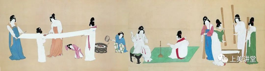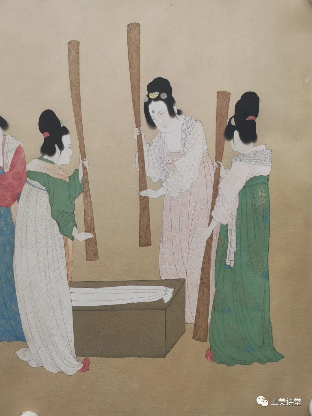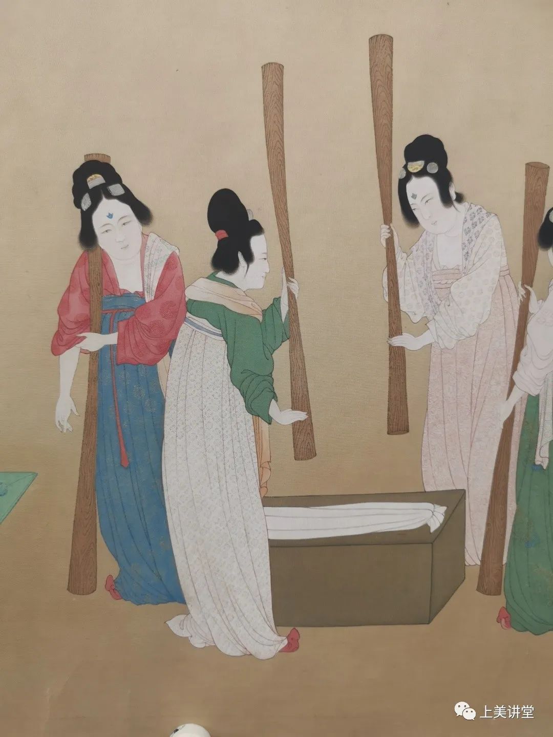 今天讲纸绢本的古代工笔人物画临摹。纸绢本工笔画可以让你掌握一套扎扎实实的程序,但壁画临摹则会使你有可能突破现在的固有的、纸绢本的程序和约束,让你会更自由的放飞,表达更丰富的感受。实际上壁画技法更早于纸绢本技法。今天只讲纸绢本,我以陈治在读我研究生期间,临摹《捣练图》的课程为范例。
