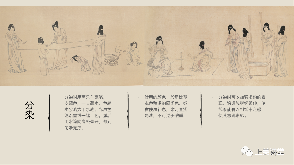 这个讲座是针对上海美院本科生的讲座,讲起来比较浅显一些。分为两大部分:纸绢本工笔画、古代壁画,它俩有截然不同的程序。